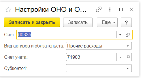 При нажатии на кнопку «Провести» документ, на основании произведенных настроек, рассчитает ведомость учета ОНО и ОНА, посчитает изменения, относительно предыдущей ведомости (если она есть), на основании которых сформирует проводки. Важно: документ ставит в дебет проводки активный счет, а в кредит — пассивный. Это означает, что не важно, активный или пассивный счет учета указан в настройке.